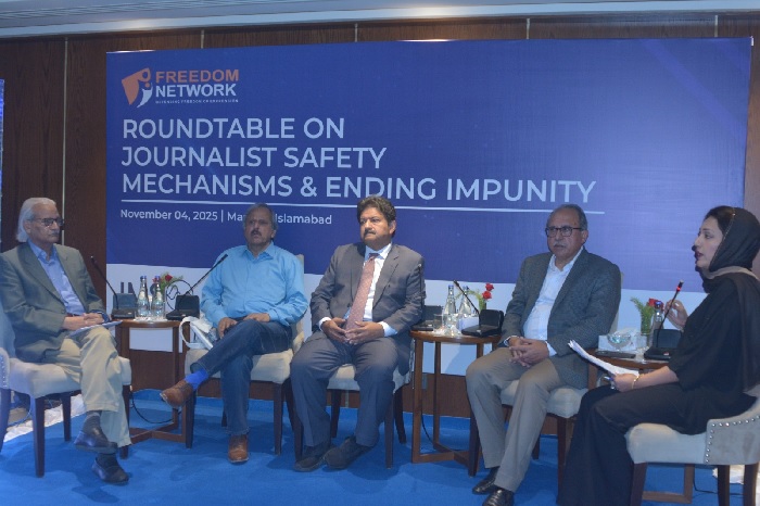 اسلام آباد:اسلام آباد کے ایک مقامی ہوٹل میں میڈیا کے نگران ادارے فریڈم نیٹ ورک کے زیر اہتمام “جرنلسٹس سیفٹی میکنزمز اینڈ اینڈنگ امپیونٹی” کے عنوان سے گول میز اجلاس منعقد ہوا۔ یہ اجلاس جرمنی، نیدرلینڈز اور فرانس کے سفارت مزید پڑھیں